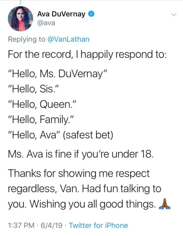 “For the record, I happily respond to: “Hello, Ms. DuVernay” “Hello, Sis.” “Hello, Queen.” “Hello, Family.” “Hello, Ava” (safest bet) Ms. Ava is fine if you’re under 18. Thanks for showing me respect regardless, Van. Had fun talking to you. Wishing you all good things.”