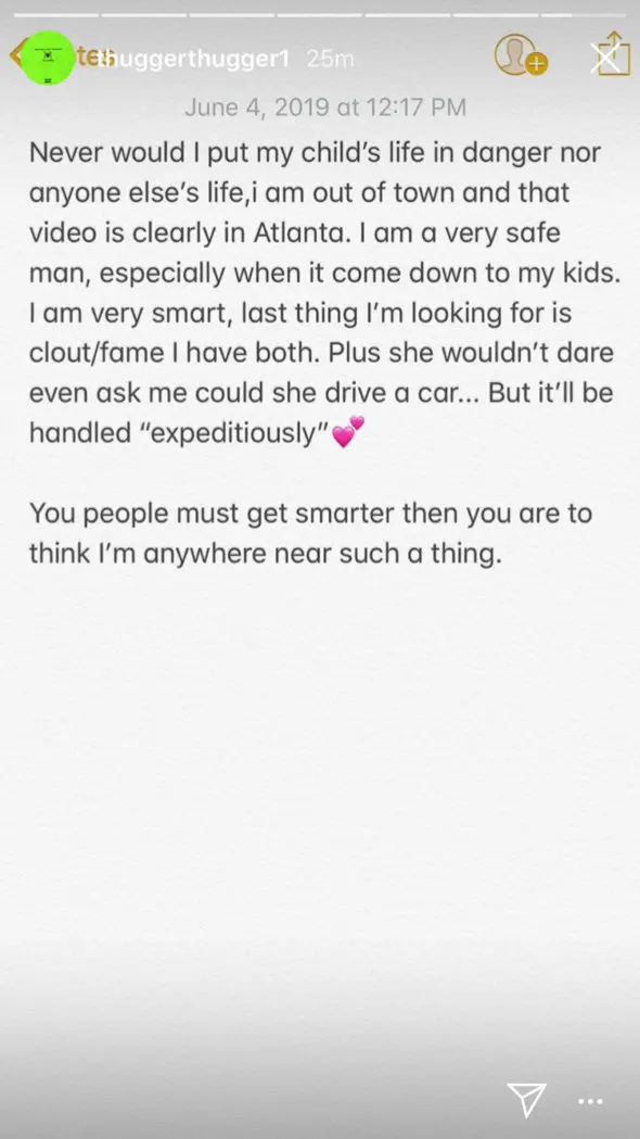 “Never would I put my child’s life in danger nor anyone else’s life, i am out of town and that video is clearly in Atlanta. I am a very safe man, especially when it come down to my kids. I am very smart, last thing I’m looking for is clout/fame I have both. Plus she wouldn’t dare even ask me could she drive a car…But it’ll be handled “expeditiously” You people must be smarter then you are to think I’m anywhere near such a thing.”