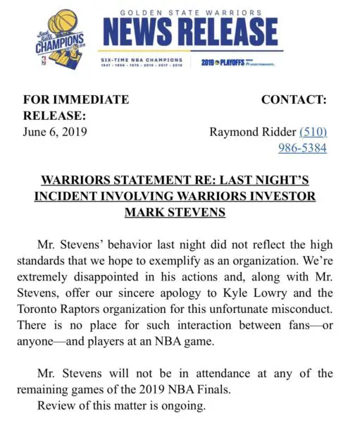 Fast forward to Thursday, The Warriors released a statement on the incident during the finals with Stevens pushing Lowry. Their statement includes an apology to the Raptors and Lowry.