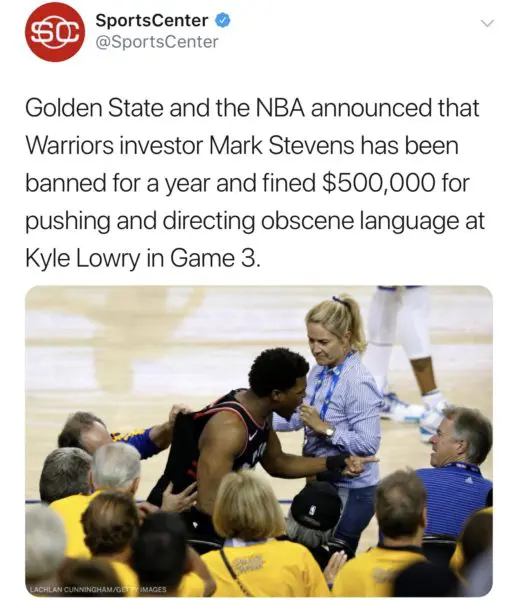 “Mr. Stevens’ behavior las night did not reflect the high standards that we hope to exemplify as an organization. We’re extremely disappointed in his actions and, along with Mr. Stevens, offer our sincere apology to Kyle Lowry an the Tornoto Raptors organization for this unfortunate misconduct. There is no place for such interaction between fans or anyone and players at an NBA game.”