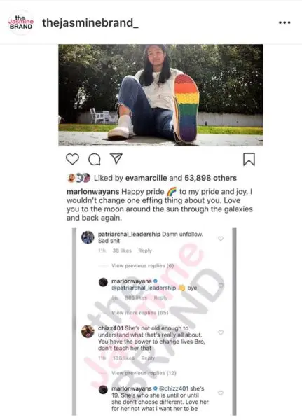 Funny man Marlon Wayans‘ kids are no laughing matter. June is National LGBTQ Pride Month, and his 19-year-old daughter Amai celebrated her sexuality with a rainbow-soled Instagram photo. He reposted it with a loving caption, and was met with loads of homophobic comments. He said: