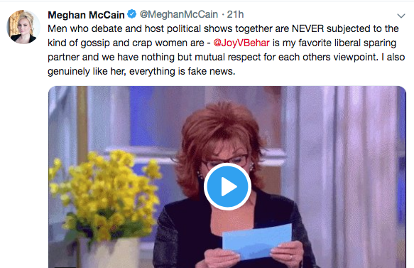 Men who debate and host political shows together are NEVER subjected to the kind of gossip and crap women are – @JoyVBehar is my favorite liberal sparing partner and we have nothing but mutual respect for each others viewpoint. I also genuinely like her, everything is fake news.