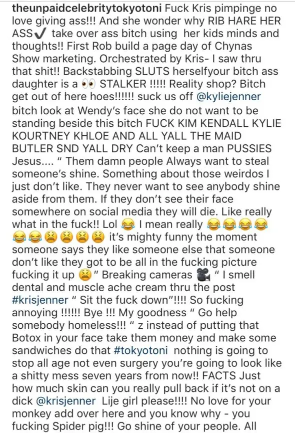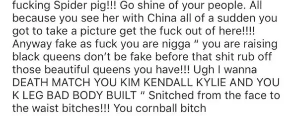 “Suck us of @kyliejenner b**ch look at Wendy’s face she do not want to be standing beside this b**ch F**K KIM KENDALL KYLIE KOURTNEY KHLOE AND ALL YALL THE MAID BUTLER SND YALL DRY Can’t keep a man P***IES”