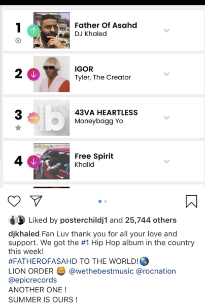 “Fan Luv thank you for all your love and support. We got the #1 Hip Hop album in the country this week! #FATHEROFASAHD TO THE WORLD! LION ORDER @wethebestmusic @rocnation @epicrecords ANOTHER ONE ! SUMMER IS OURS !”