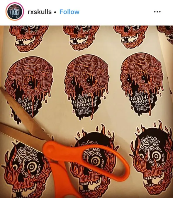 The pulled items include an orange hoodie and pins that featured a skull design that was very similar to the one originally created by Rx Skulls.