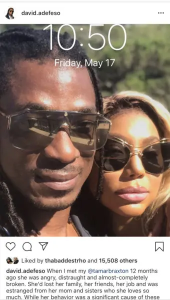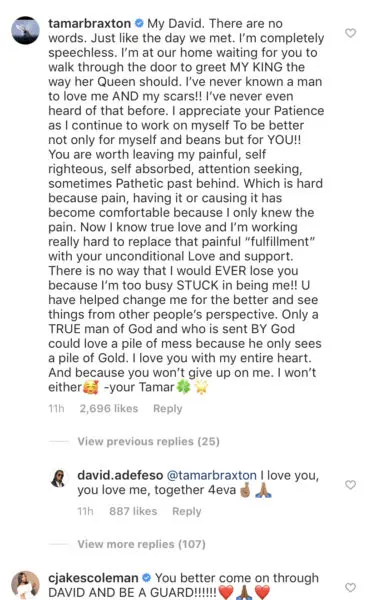Her message came after Adefeso posted a lengthy note about how he and Braxton started dating when she was in a pretty bad place. She wasn’t speaking to her family and had previously been let go from daytime talk show The Real. He explained in the caption how he discovered Braxton had pain that was deeper than even she understood, and how he was able to love her through it all.