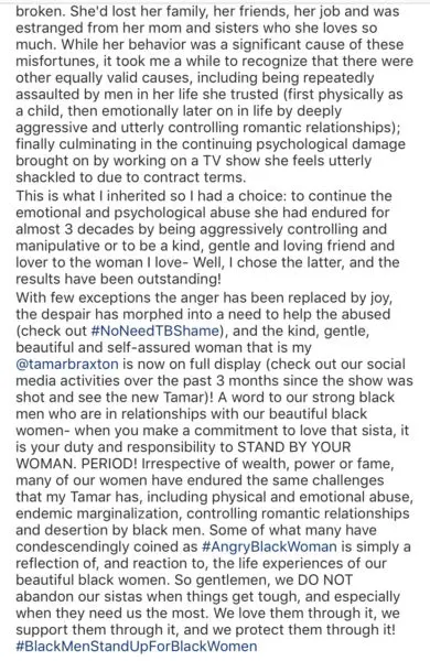 “With few exceptions the anger has been replaced by joy, the despair has morphed into a need to help the abused (check out #NoNeedTBShame), and the kind, gentle, beautiful and self-assured woman that is my @tamarbraxton is now on full display (check out our social media activities over the past 3 months since the show was shot and see the new Tamar)! A word to our strong black men who are in relationships with our beautiful black women- when you make a commitment to love that sista, it is your duty and responsibility to STAND BY YOUR WOMAN. PERIOD! Irrespective of wealth, power or fame, many of our women have endured the same challenges that my Tamar has, including physical and emotional abuse, endemic marginalization, controlling romantic relationships and desertion by black men. Some of what many have condescendingly coined as #AngryBlackWoman is simply a reflection of, and reaction to, the life experiences of our beautiful black women. So gentlemen, we DO NOT abandon our sistas when things get tough, and especially when they need us the most. We love them through it, we support them through it, and we protect them through it! #BlackMenStandUpForBlackWomen“