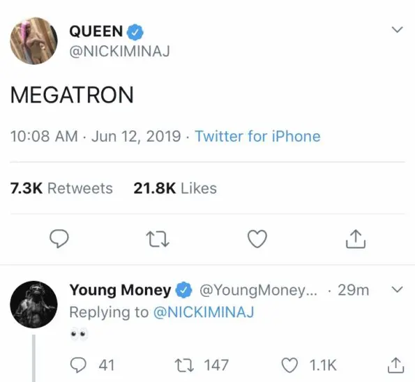 Could this be a new song? New album? Nicki is leaving fans and followers to their own devices, not giving any insight on the tweet. Even her home record label, Young Money, is keeping mum on the tweet – replying with wide emoji eyes.
