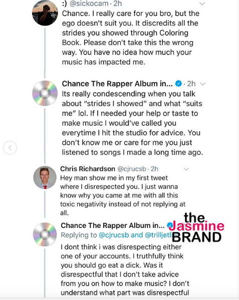 Chance then turned his attention to a fan who said he was disappointed in the rapper’s behavior, noting that the “ego doesn’t suit you” and instead “discredits all the strides” he showed in Chance’s previous project, Coloring Book. Chance said,