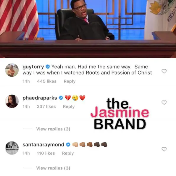 After sharing his raw emotions, former Real Housewives of Atlanta star, Phaedra Parks and Raymond Santana, one of the five accused in the series, both posted emojis supporting Mathis’ message. Comedian Guy Torry says after finishing ‘When They See Us,’ he compared the true life story to the classic movie, ‘Roots‘ and ‘Passion of Christ.’ He says,