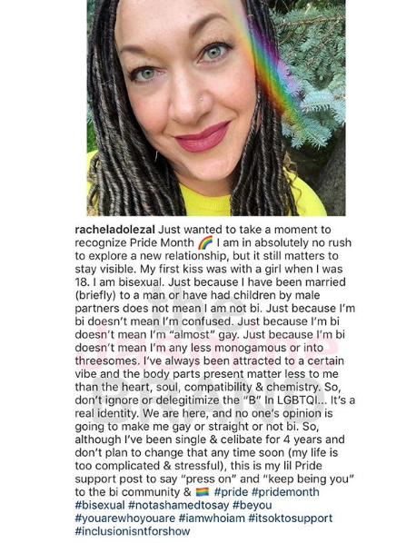 “Just wanted to take a moment to recognize Pride Month ? I am in absolutely no rush to explore a new relationship, but it still matters to stay visible. My first kiss was with a girl when I was 18. I am bisexual. Just because I have been married (briefly) to a man or have had children by male partners does not mean I am not bi. Just because I’m bi doesn’t mean I’m confused. Just because I’m bi doesn’t mean I’m “almost” gay. Just because I’m bi doesn’t mean I’m any less monogamous or into threesomes. I’ve always been attracted to a certain vibe and the body parts present matter less to me than the heart, soul, compatibility & chemistry.”