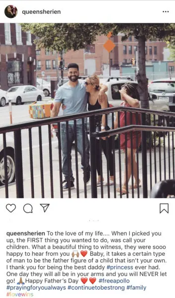 “To the love of my life…. When I picked you up, the FIRST thing you wanted to do, was call your children. What a beautiful thing to witness, they were sooo happy to hear from you ???? Baby, it takes a certain type of man to be the father figure of a child that isn’t your own. I thank you for being the best daddy #princess ever had. One day they will all be in your arms and you will NEVER let go! ??Happy Father’s Day #freeapollo#prayingforyoualways#continuetobestrong #family #lovewins“