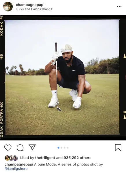 While out on the green, Drake takes a pose with his golf club for the camera while wearing a designer durag as he pins his golf ball to the ground.