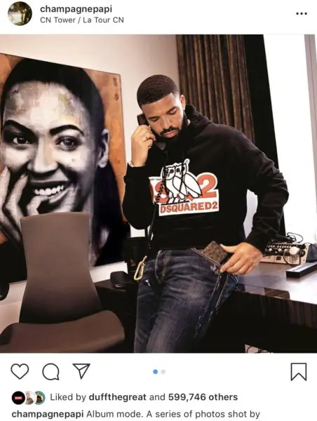 In one photo, Drake was photographed in what seems to be his home office with a giant self portrait of R&B diva Beyonce in the background. Could this be a sign he is collaborating with Queen B on his next single? Many of the captions simply read,