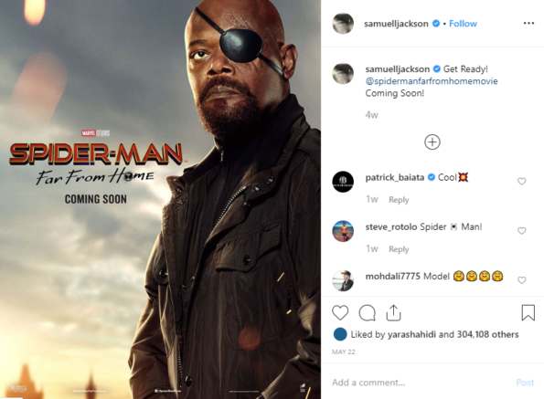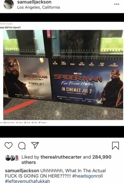 Actor Samuel L. Jackson loves dropping an F-bomb almost as much as he loves starring in blockbuster films! He’s reprising his role as Marvel character, Nick Fury, in the upcoming “Spider-Man: Far From Home” movie – but there’s a slight problem. A mistake is being printed on the movie’s promo posters! On some of the graphics, Samuel’s eye-patch is shown on his right eye, while others are shown on his left eye! He posted proof of the mistake with this Instagram caption: