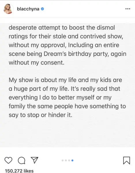 Interestingly enough, her statement comes about a week after she called Keeping Up With The Kardashians “stale” and “contrived” amid reports Rob wouldn’t let Dream appear on her upcoming reality show The Real Blac Chyna. She wrote,