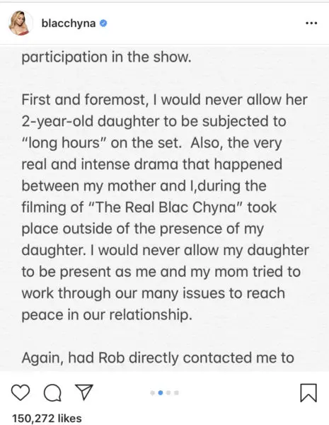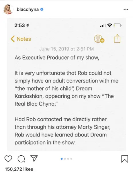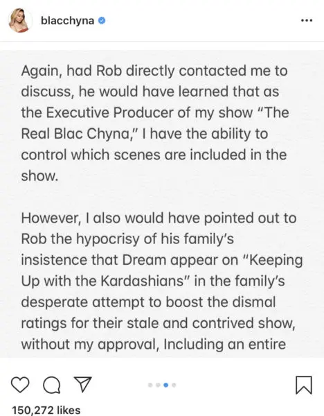 Interestingly enough, her statement comes about a week after she called Keeping Up With The Kardashians “stale” and “contrived” amid reports Rob wouldn’t let Dream appear on her upcoming reality show The Real Blac Chyna. She wrote,