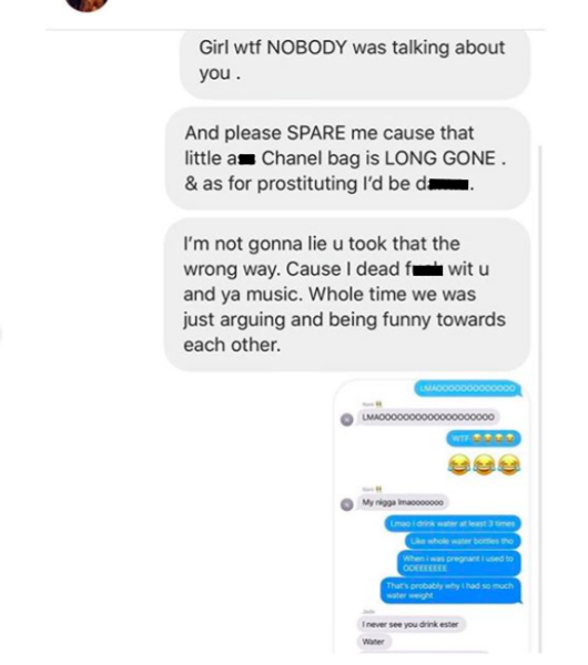 “Y’all h*es keep my name out y’all mouth… when y’all talk don’t forget to mention I’m richer then all y’all H*ES! Already spared you… You still walking around with the Chanel [redacted name] bought you h*e sit yo tired prostituting a** down!”