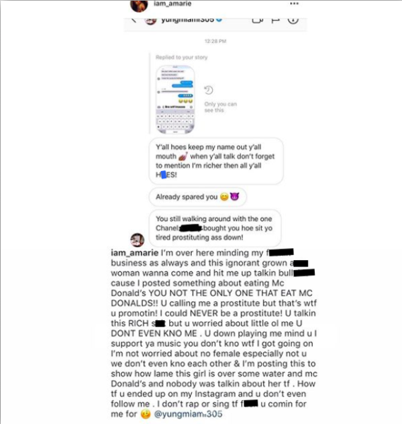 “I’m over minding my f***in business as always and this ignorant grown a** woman wanna come and hit me up talkin bulls*** cause I posted something about eating Mc Donald’s YOU NOT THE ONLY ONE THAT EAT MC DONALDS!! U calling me a prostitute but that’s wtf u promotin! I could NEVER be a prostitute! U talkin this RICH s*** but u worried about little ol me U DON’T EVEN KNOW ME. U down playing me mind u I support ya music you don’t know wtf I got going on I’m not worried about no female especially not u we don’t even kno each other & I’m posting this to show how lame this girl is over some water and mc Donald’s and nobody was talkin aout her tf. How tf u ended up on my Instagram and u don’t even follow me. I don’t rap or sing tf f*** u comin for me for @yungmiami305”
