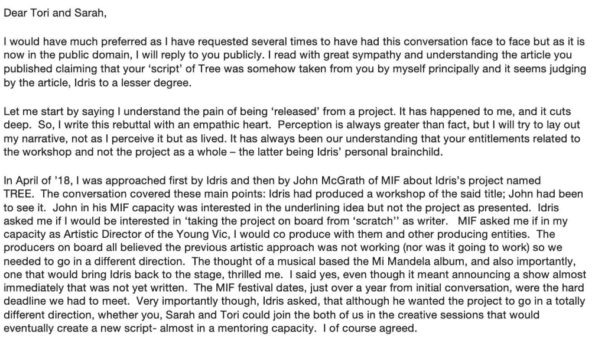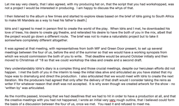 “Also on that day, there was a phone call out of the blue from Idris to Tori to say he was sending over a revised synopsis by Kwame, and that he had only just seen it himself. We were a bit confused as to why Kwame would be writing a synopsis. When the email came later that day, in the cover letter at the top it had Kwame’s clear intention to write the piece stating ‘when I sit to write the first draft…’. This was very surprising to us after what he had told us when we met. A quiet panic set in.”