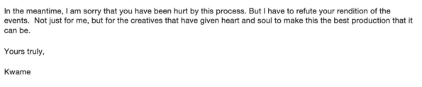 “We had been kept in the dark for months whilst the project moved forward, and had repeatedly responded as promptly as possible, as well as trying to speak to Kwame directly to see if we could find a resolution, which was denied.”