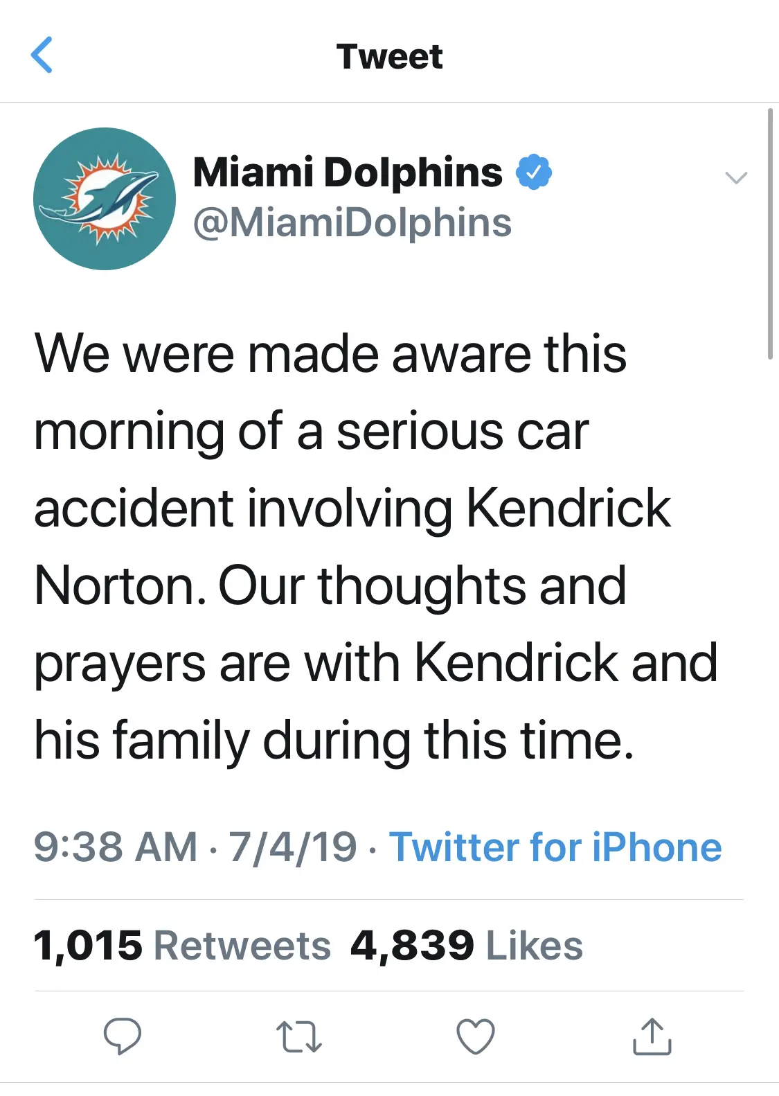 Miami Dolphins defensive liner Kendrick Norton, who used to play for the University of Miami football team, was involved in a severe car accident in the early morning of Thursday (July 4th) that the press labels “career-ending”.