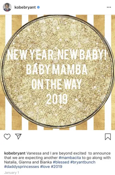 “Vanessa and I are beyond excited to announce that we are expecting another #mambacita to go along with Natalia, Gianna and Bianka #blessed #bryantbunch#daddysprincesses #love #2019“