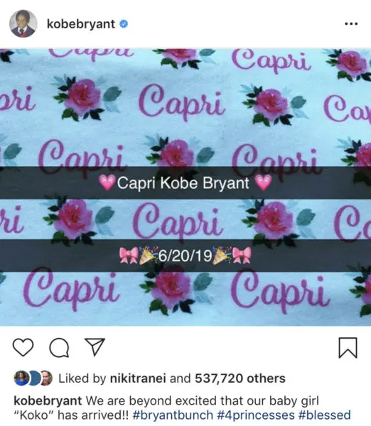 “Here’s our sweet baby girl! Capri Kobe Bryant 6/20/19”