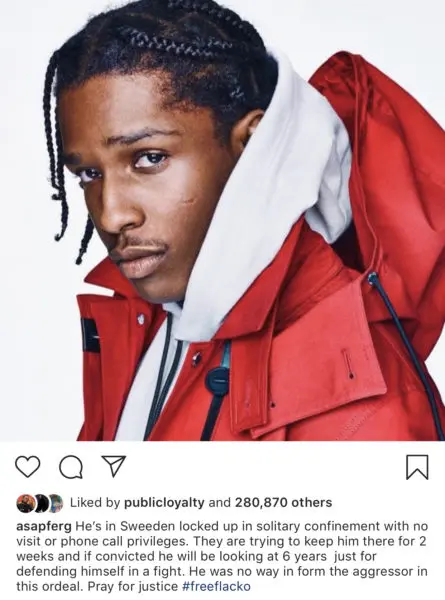 “Caught up in a street fight a couple of days ago, but that was not his fault. But because footage of the incident was so widely shared on social media Swedish authorities have decided to make an example of him. Now he faces being held in jail until a full court hearing in August – which will totally jeopardize his music career.”