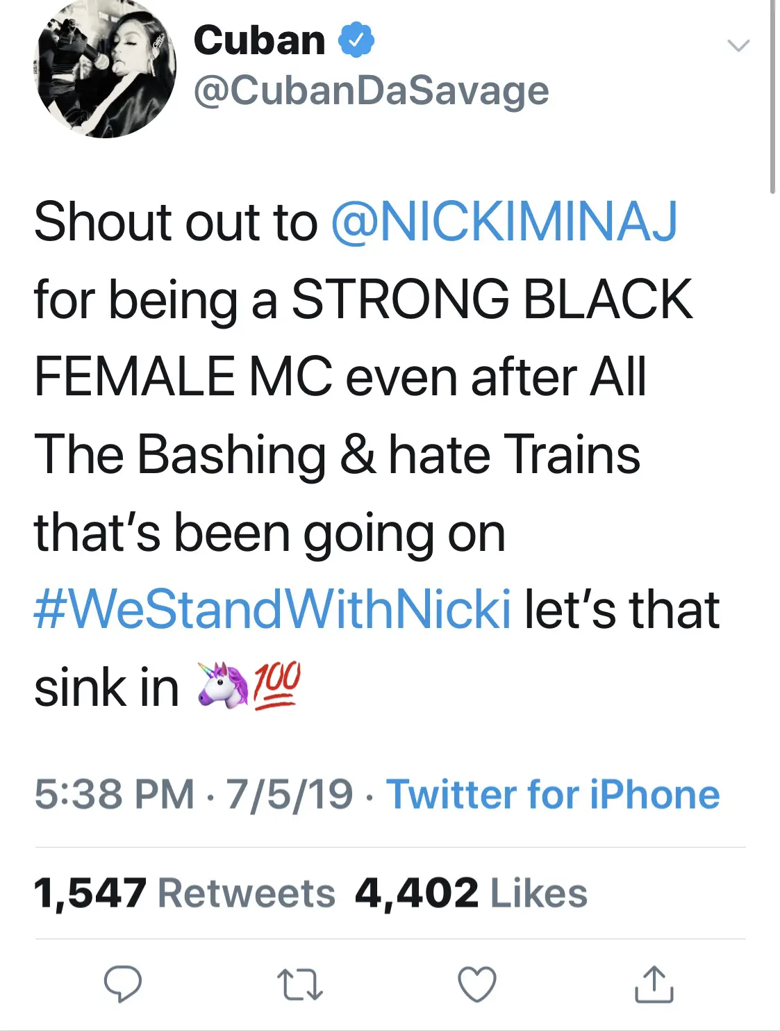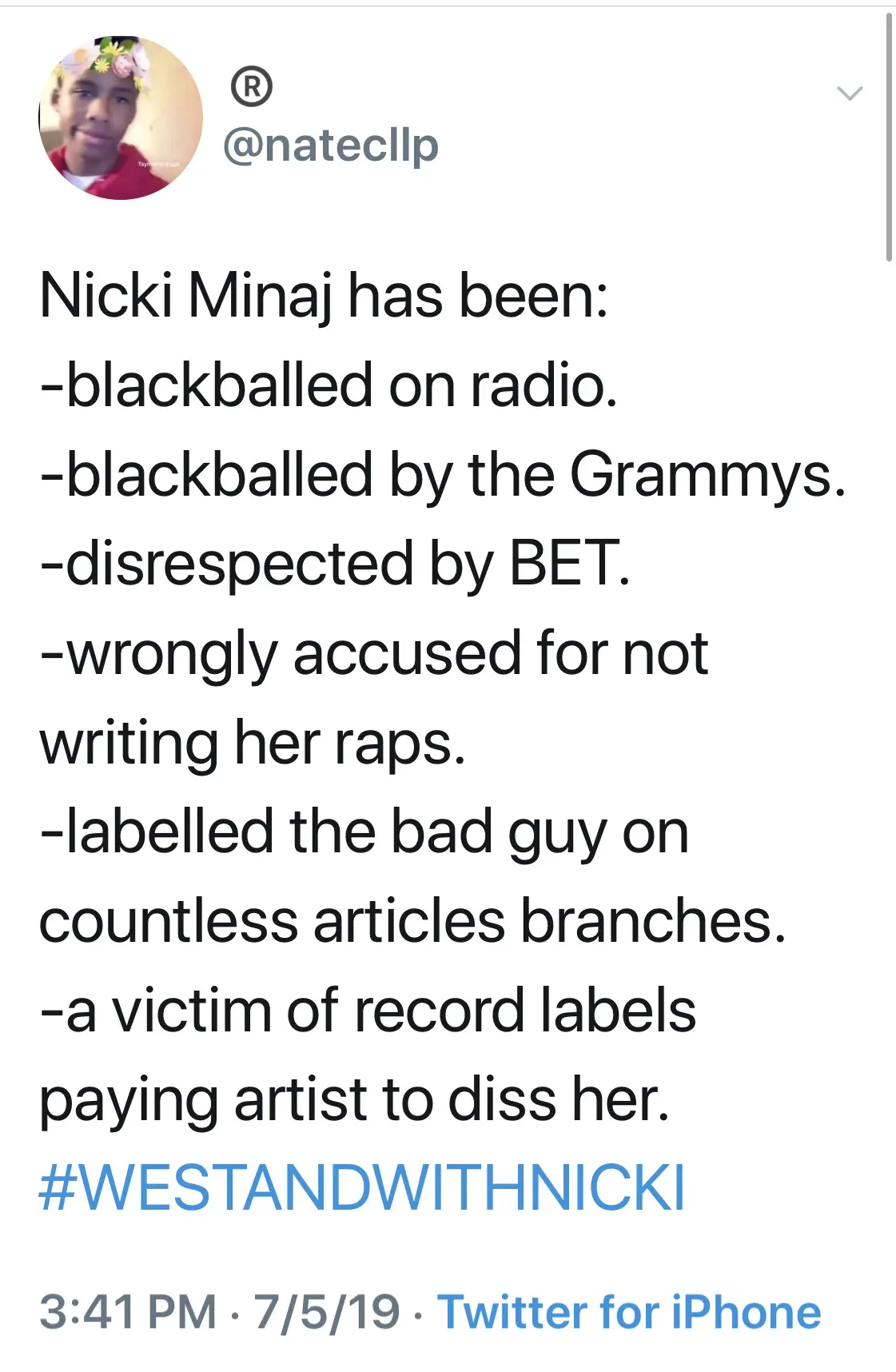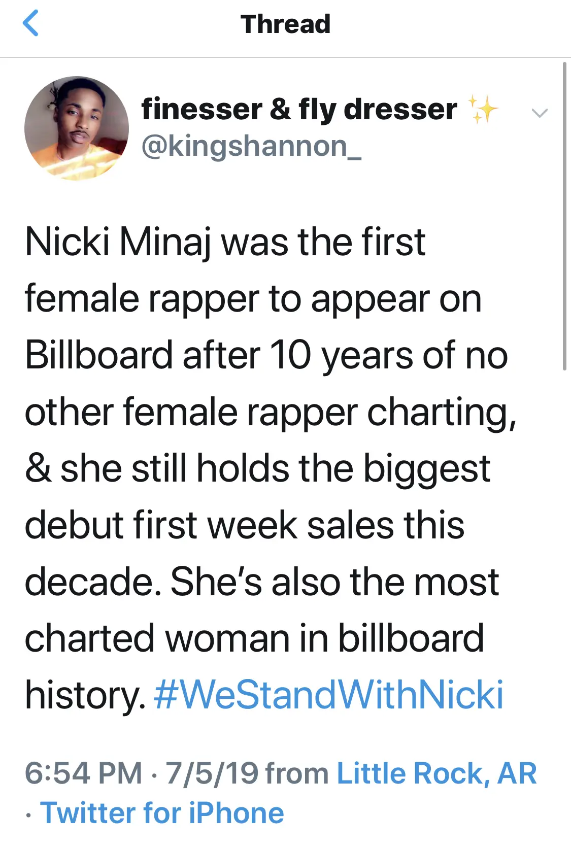 “I always shouted out my influences in my interviews. Now a days, it’s become cool to pretend u weren’t influenced by other artists. S/O to the ones big enough to do it: Kash, Asian, Cuban, Saweetie, Meg, Malibu, YOUNG MA, Ms. Banks, Lady Leshurr, etc. No female rapper (other than Trina) did a song w/me or congratulated me on my billboard accomplishments. I didn’t mind. I never felt they were obligated to do so. Just like Beyoncé isn’t obligated to congratulate or collaborate with Normani, etc. — I never had a crusade by radio stations, influencers & blogs to make my song number 1 when Anaconda was #2 on the Hot 100. I never had a group of men in the studio writing my songs for me so it took a while between albums. Please stop these write ups about what I didn’t do. Y’all are rlly sick & ima call y’all out one by one on Queen Radio. Most of yall doing these write ups have never fought for anything in life. You just sit on the sidelines & watch the doers do!!!! To my fans; I love, cherish you, adore you, and thank you. God bless you.”