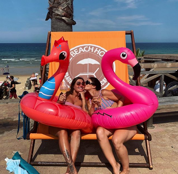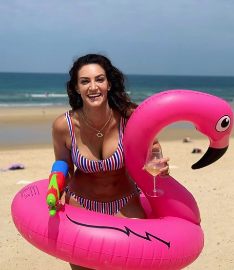 The mother of Drake’s son, Sophie Brussaux, is showing off her bikini body. Over the holiday weekend, she was spotted on the beach in Lacanua, Aquitaine, France. In one photo, she hold a water gun in one hand and a glass of wine in the other, with a blow-up flamingo around her waist. Wearing a red, white and blue stripped bikini she captioned the image