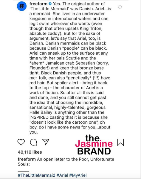 “Yes. The original author of ‘The Little Mermaid’ was Danish. Ariel…is a mermaid. She lives in an underwater kingdom in international waters and can legit swim wherever she wants (even though that often upsets King Triton, absolute zaddy). But for the sake of argument, let’s say that Ariel too, is Danish. Danish mermaids can be black because Danish *people* can be black.”