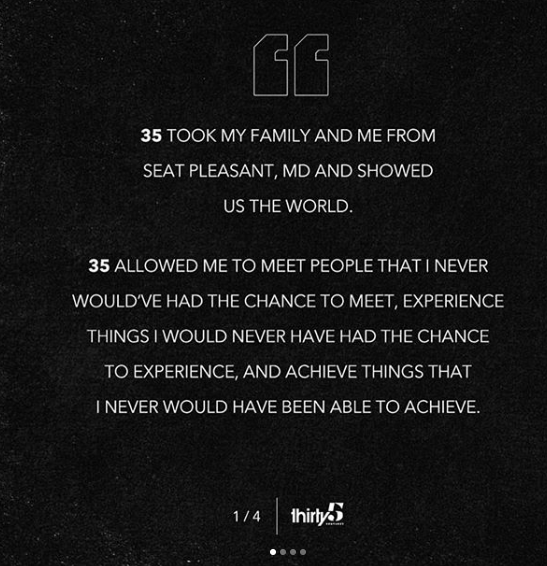 “35 took my family and me from Seat Pleasant, MD and showed us the world. 35 allowed me to meet people that I never would’ve had the chance to meet, experience things I would never have had the chance to experience, and achieve things that I never would have been able to achieve. 35 allowed me to go to the University of Texas to play basketball, 35 allowed me to achieve my dream of playing in the NBA in Seattle.