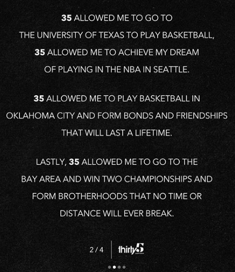 35 allowed me to play basketball in Oklahoma City and form bonds and friendships that will last a lifetime. Lastly, 35 allowed me to go to the Bay Area and win two championships and form brotherhoods that no time or distance will ever break. 35 was chosen in honor of someone very near and dear to me. I will always honor him and honor the number 35.