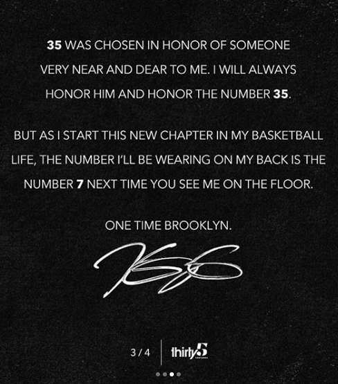 But as I start this new chapter in my basketball life, the number I’ll be wearing on my back is the number 7 next time you see me on the floor. One time Brooklyn.”