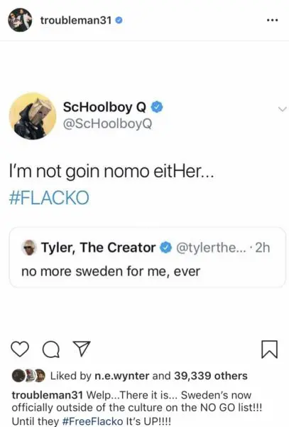 “@troubleman31 Welp…There it is… Sweden’s now officially outside of the culture on the NO GO list!!! Until they #FeeFlacko It’s UP!!!!!”