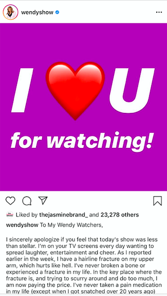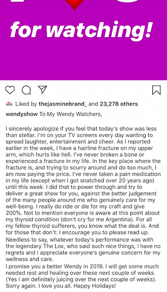 “Over the past few days, Wendy has experienced complications regarding her Graves’ disease that will require treatment. Wendy will be under the strict supervision of her physicians, and as part of her care, there will be significant time spent in the hospital. Despite her strong desire to return, she is taking a necessary, extended break from her show to focus on her personal and physical well-being. Wendy thanks everyone in advance for their well-wishes and for respecting her and The Hunter Family’s privacy during this time.”