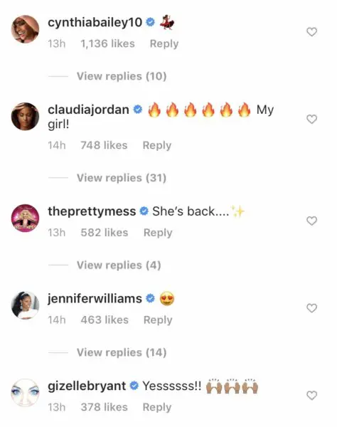 Black reality show royalty showed up and showed out in the comment section, expressing their excitement for Kenya’s return. Her longtime friend and co-star, Cynthia Bailey, along with her sister, Mallory showed their support. “Real Housewives of Potomac” star Gizelle Bryant, “Basketball Wives” star Jennifer Williams, and former “Flavor of Love” contestant Deelishis also put in their two cents.