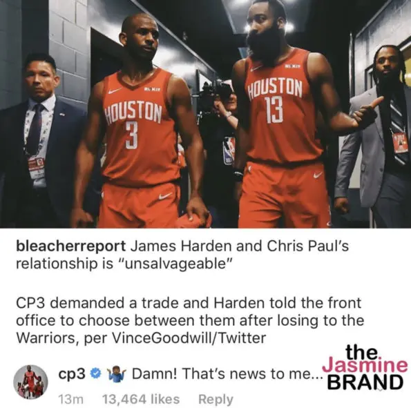 As previously reported, the blockbuster trade came soon after Paul and Rockets star guard, Harden’s relationship allegedly went south as CP3 went to Rockets management and demanded a trade. Following his demands, Harden issued a “him or me,” scenario to the front office, which lead to their relationship being labeled as “unsalvageable.” Although, this news came to a surprise to CP3 as he took to Instagram to respond. The Rockets former guard says,
