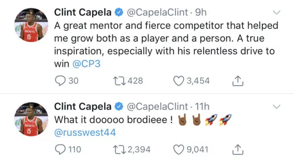 CP3’s former teammate, Clint Capela took to Twitter to welcome Westbrook to the Rockets and to send CP3 off to the Thunder, calling him an inspiration. He first tweets to Westbrook,