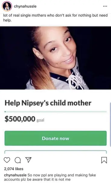 The campaign was called “Help Nipsey’s Child’s Mother” and had a photo of Tanisha. It said in part,