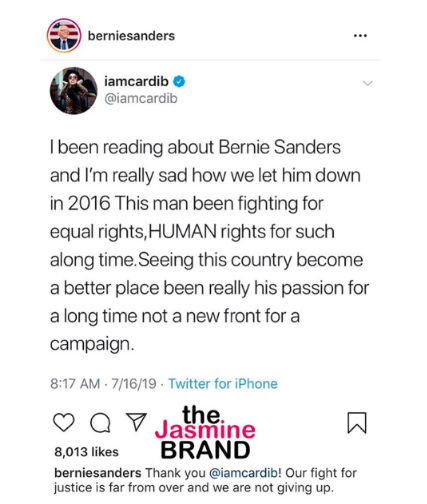 If Cardi has her way, Bernie Sanders will win the 2020 Presidential race too.