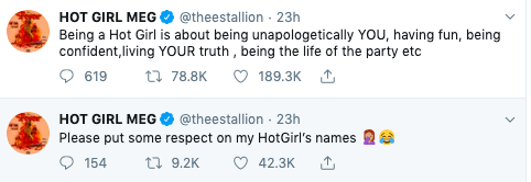 “Please put some respect on my HotGirl’s names. Being a Hot Girl is about being unapologetically YOU, having fun, being confident,living YOUR truth , being the life of the party etc”