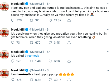“It’s called #freemeek… It’s deceiving when they give you probation you think you leaving but in get technical when they giving violations for even breathing…I took my pen and pad and turned it into businesses… this ain’t no cap I used to trap now my business lids… now I can’t tell you mind ya business cause my business is …really on ya mind where ya fitted is”