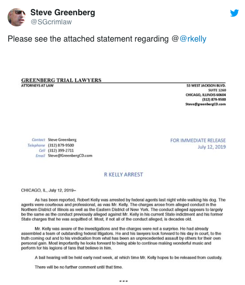 “As has been reported, Robert Kelly was arrested by federal agents last night while walking his dog. The agents were courteous and professional, as was Mr. Kelly. The charges arose from alleged conduct in the Northern District of Illinois as well as the Eastern District of New York. The conduct alleged appears to largely be the same as the conduct previously alleged against Mr. Kelly in his current State indictment and his former State charges that he was acquitted of. Most, if not all of the conduct alleged, is decades old.”