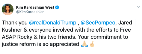 “Thank you @realDonaldTrump @SecPompeo, Jared Kushner & everyone involved with the efforts to Free ASAP Rocky & his two friends. Your commitment to justice reform is so appreciated”