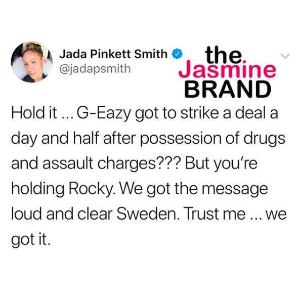 “Hold it … G-Eazy got to strike a deal a day and half after possession of drugs and assault charges??? But you’re holding Rocky. We got the message loud and clear Sweden. Trust me … we got it.”