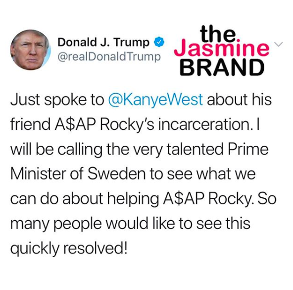 “Just spoke to @KanyeWest about his friend A$AP Rocky’s incarceration. I will be calling the very talented Prime Minister of Sweden to see what we can do about helping A$AP Rocky. So many people would like to see this quickly resolved!”