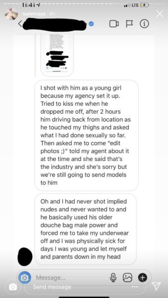“I shot with him as a young girl because my agency set it up. Tried to kiss me when he dropped me off, after 2 hours him driving back from location as he touched my thoughts and asked what I had done sexually so far.”