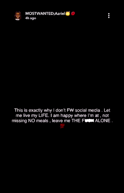 “This is exactly why I don’t FW social media. Let me live my LIFE. I am happy where I’m at. not missing NO meals. leave me THE F*** ALONE.”